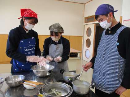 本日の4限の授業の様子 公開日 2022/11/02 更新日 2022/11/02 日々の活動から 11月2日(水) 本日の4限の授業の様子です。 1年生は、理科で溶解度の計算をしていました。 2年生は、保健体育で「側方倒立回転の練習をしよう」という内容の授業でした。 3年生は、家庭科で「とうふだんご」を作っていました。