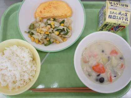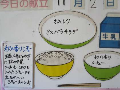 本日の給食メニューと放送室 公開日 2022/11/02 更新日 2022/11/02 日々の活動から 11月2日(水) 本日の給食メニューです。 ごはん、牛乳、オムレツ、アスパラサラダ、秋の香りシチュー 後期の放送当番の生徒の様子です。。