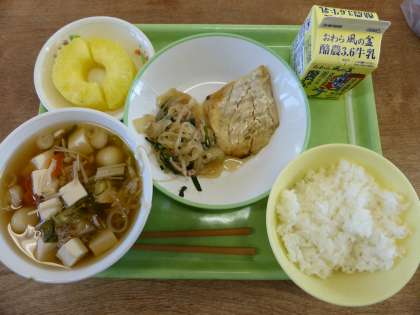 ごはん、牛乳、さばの塩焼き、しらたきのピリ辛炒め、白玉汁、パインアップル