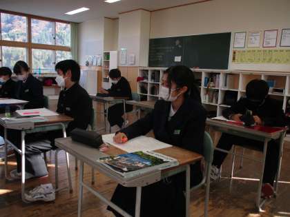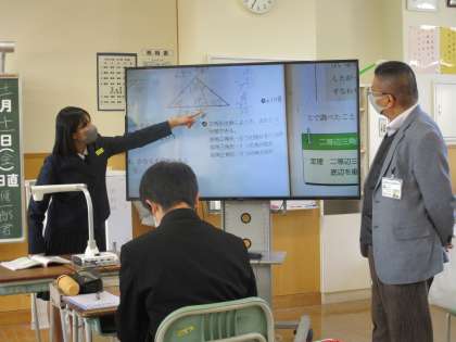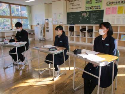 1限の授業 公開日 2022/11/11 更新日 2022/11/11 日々の活動から 11月11日(金) 1限の授業の様子です。 1年生は、英語でテストの見直しをしていました。 2年生は、数学で「二等辺三角形の底角は等しい」という定理を使った問題を考えていました。 3年生は、社会で「市場経済と需要・供給」という内容の授業でした。