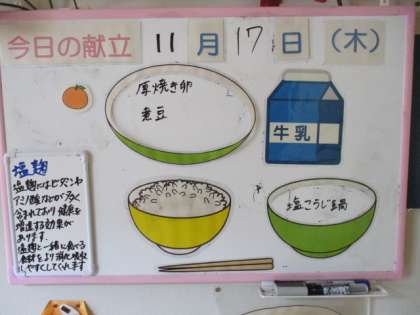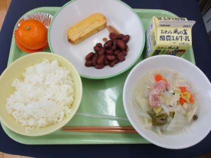 ごはん、牛乳、煮豆、厚焼き卵、塩こうじ鍋、みかん