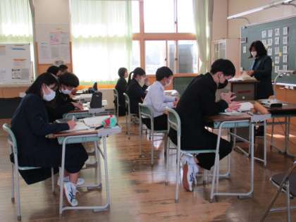 3限の授業の様子 公開日 2022/11/28 更新日 2022/11/28 日々の活動から 11月28日(月) 1年生は、英語で英語の基本ルールを学んでいました。 2年生は、国語で漢文の復習をしていました。 3年生は、社会で「消費者としてだまされないために」という内容の授業でした。