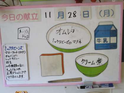給食メニュー 公開日 2022/11/28 更新日 2022/11/28 日々の活動から 11月28日(月) 給食メニューです。 食パン、牛乳、オムレツ、ミックスビーンズのマリネ、クリーム煮、メープルジャム