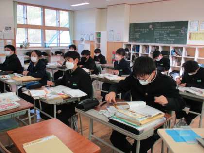 5限の授業の様子 公開日 2022/11/29 更新日 2022/11/29 日々の活動から 11月28日(月) 1年生は、理科で「水の沸点」という内容の授業でした。 2年生は、社会で「戊辰戦争」という内容の授業でした。 3年生は、英語でこれまでの復習をしていました。