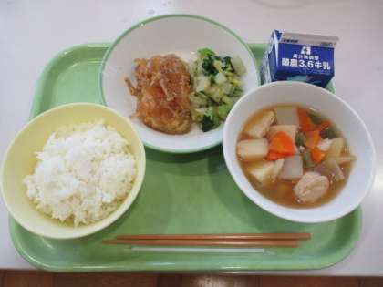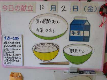 12月2日(金) 給食メニューです。 ごはん、牛乳、魚の黒酢あん、はくさいひたし、関東だき