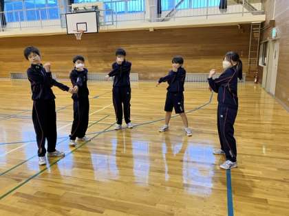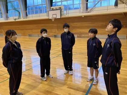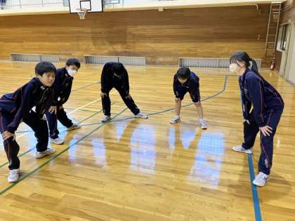 写真は最後の体操の様子と終わりのミーティングの様子です。