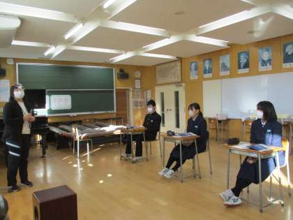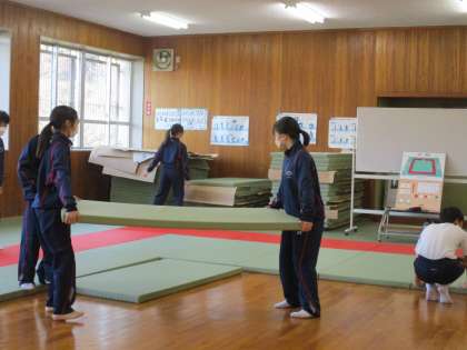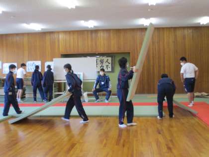 1限の授業の様子 公開日 2022/12/05 更新日 2022/12/05 日々の活動から 12月5日(月) 1・2年合同保健体育、格技室に畳をひいていました。次回から本格的に柔道の授業が始まります。 3年生は、音楽で卒業式の歌の話がありました。
