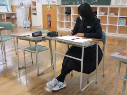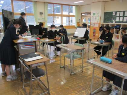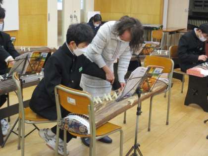 6限の授業の様子 公開日 2022/12/05 更新日 2022/12/05 日々の活動から 12月5日(月) 1年生は、音楽で5限に引き続き琴に挑戦していました。 2年生は、学級活動で集会の準備をしていました。 3年生は、学級活動で担任と進路相談をしていました。