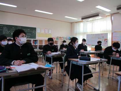 1限の授業の様子 公開日 2022/12/12 更新日 2022/12/12 日々の活動から 12月12日(月) 1年生は、数学で「いろいろな作図」という内容の授業でした。円の接線の作図などをかいていました。 2年生は、保健体育で「けさ固めを身に付けよう」という内容の授業でした。 3年生は、音楽で「ギターの音階をひこう」という内容の授業でした。