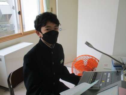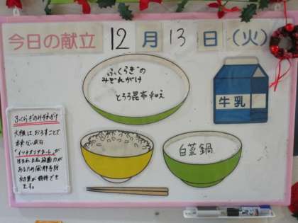 給食メニューと放送室 公開日 2022/12/13 更新日 2022/12/13 日々の活動から 12月13日(火) 給食メニューです。 ごはん、ふくらぎのみぞれかけ、とろろ昆布和え、白菜鍋、牛乳です。 放送当番の様子です。