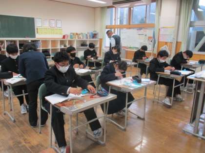 5限の授業の様子 公開日 2022/12/13 更新日 2022/12/13 日々の活動から 12月13日(火) 1年生は、数学で「いろいろな角度を作図してみよう」という内容の授業でした。 2年生は、理科でこれまでの復習をしていました。 3年生は、英語の確認テストでした。