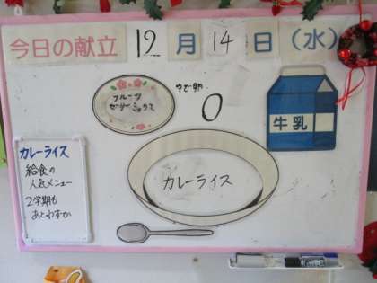 給食メニューと放送室 公開日 2022/12/14 更新日 2022/12/14 日々の活動から 12月14日(水) 給食メニューです。 ごはん、牛乳、カレーライス、ゆで卵、福神漬、フルーツゼリーミックス 放送当番の様子です。