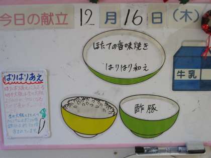給食メニューと放送室 公開日 2022/12/16 更新日 2022/12/16 日々の活動から 12月16日(金) 給食メニューです。 ごはん、ほたての香味焼き、はりはり和え、酢豚、牛乳です。 放送当番の様子です。