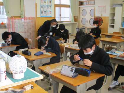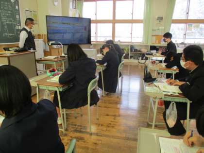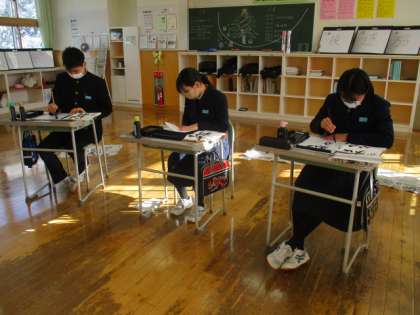 2限の授業の様子 公開日 2022/12/20 更新日 2022/12/20 日々の活動から 12月20日(火) 1限の授業の様子です。 1年生は、美術でテープカッターの側面を彫っていました。 2年生は、数学で「特別な平行四辺形」という内容の授業でした。 3年生は、国語で「温故知新」と書き初めの練習をしていました。