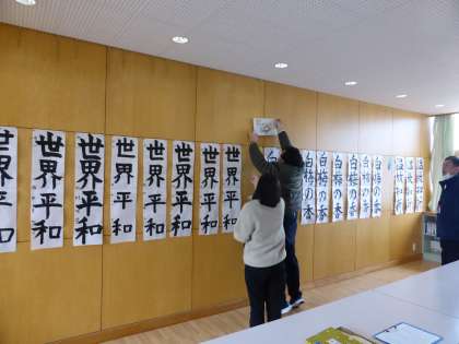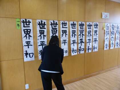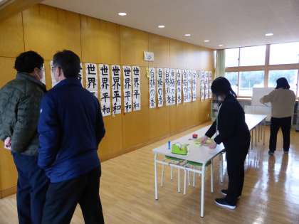書き初め大会 審査中 公開日 2023/01/10 更新日 2023/01/10 日々の活動から 1月10日(火) 中央にタイトルを掲示しました。 その後全教員で審査しました。 入賞者には、金か銀か赤の紙が付いています。 誰に何色の紙が付いているでしょうか?
