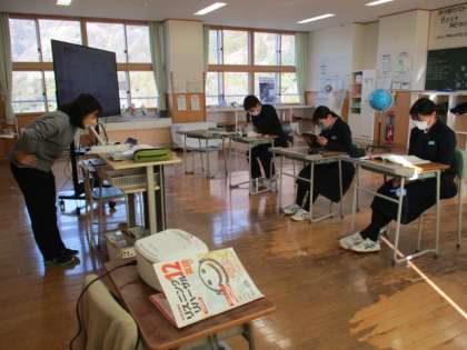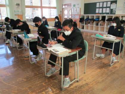 5限の授業の様子 公開日 2023/01/12 更新日 2023/01/12 日々の活動から 1月12日(木) 1年生は、理科で、実験・観察しています。 2年生は、国語で、「君は『最後の晩餐』を知っているか」を読んでいます。 3年生は、英語の授業です。