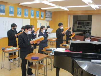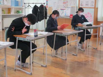 6限の授業の様子 公開日 2023/01/13 更新日 2023/01/13 日々の活動から 1月13日(金) 1年生は、音楽で「変わらないもの」という合唱曲の練習をしていました。 2年生は、理科で「日本の天気の特徴」という内容の授業でした。 3年生は、楡の木タイムで受検のしおりの読み合わせをしていました。
