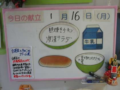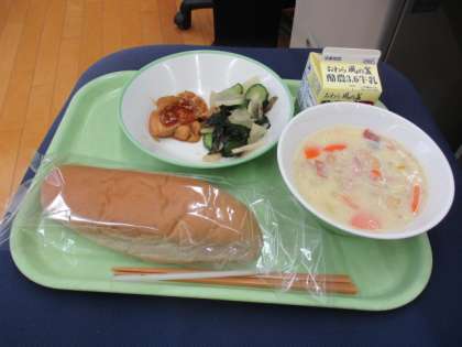 1月16日(月) 給食メニューです。 ココアコッペパン、牛乳、照焼きチキン、海藻サラダ、豆ときのこのクリーム煮