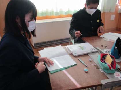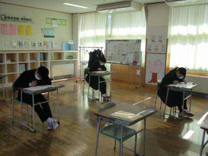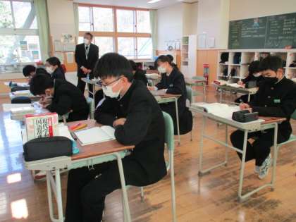 4限の授業の様子 公開日 2023/01/20 更新日 2023/01/20 日々の活動から 1月19日(木) 1年生は、国語の授業でした。 2年生は、数学で確率の実験をしていました。さころの目の出方に偏りがあるか。コインの「表」「裏」に偏りはあるか等実験していました。 3年生は、英語で確認テストでした。