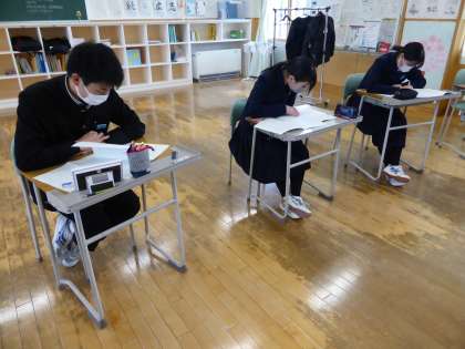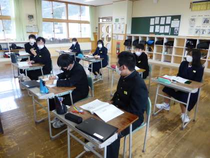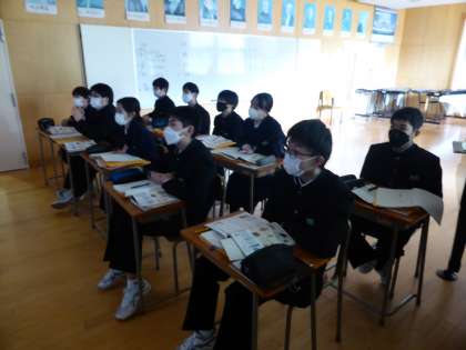 3限の授業の様子 公開日 2023/01/20 更新日 2023/01/20 日々の活動から 1月20日(金) 1年生は、音楽で動画を見て雅楽について学んでいました。 「笙」という楽器は1400年前から変わらないそうです。 2年生は、道徳で「自分を信じて生きるとは・・・」という資料を読んで話し合っていました。写真の生徒は後ろ向きに発言していました。 3年生は、学級活動で自習をしていました。
