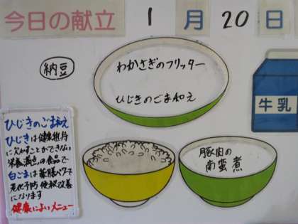 給食メニューと放送室 公開日 2023/01/20 更新日 2023/01/20 日々の活動から 1月20日(金) 給食メニューです。 ごはん、牛乳、ひじきのごま和え、わかさぎのフリッター、豚肉の南蛮煮、納豆 放送当番の様子です。