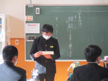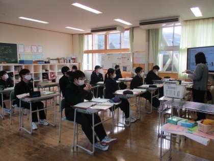 3限の授業の様子 公開日 2023/01/23 更新日 2023/01/23 日々の活動から 1月23日(月) 1年生は、英語で過去形について学んでいました。 2年生は、国語で鑑賞文を発表していました。 3年生は、社会でこれまでの復習をしていました。