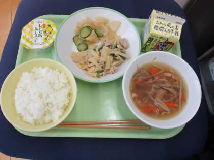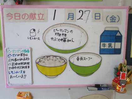 給食メニューと放送室 公開日 2023/01/27 更新日 2023/01/27 日々の活動から 1月27日(金) 給食メニューです。今日の給食は、「ピーマンマンと夜ふかし大まおう」から ごはん、牛乳、ピーマンマンの炒め物、かぶの中華和え、春雨スープ、レモンムース です。 放送当番の様子です。