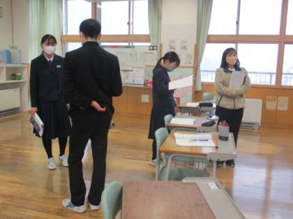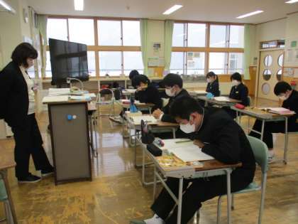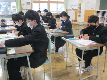 3限の授業の様子 公開日 2023/01/30 更新日 2023/01/30 日々の活動から 1月30日(月) 1年生は、数学で立体の体積について学んでいました。 ○○錐の体積は○○柱の体積の何分のいくつでしょうか? 2年生は、国語で「走れメロス」の朗読を聞いていました。 3年生は、英語でエネルギー問題に関する文章を読んでいました。