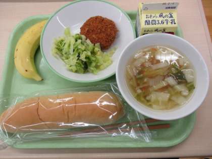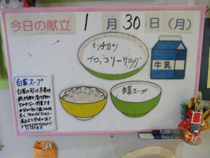 給食メニューです。 公開日 2023/01/30 更新日 2023/01/30 日々の活動から 1月30日(月) 給食メニューです。 コッペパン、牛乳、メンチカツ、ブロッコリーサラダ、はくさいスープ、バナナ