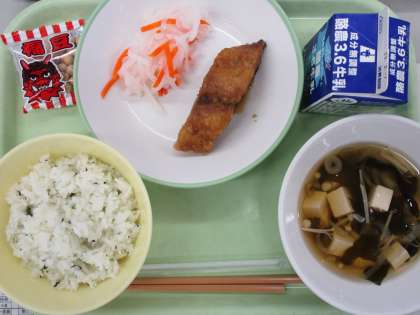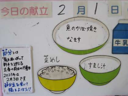 給食メニューと放送室 公開日 2023/02/01 更新日 2023/02/01 日々の活動から 2月1日(水) 給食メニューです。 菜めし、牛乳、魚のかば焼き、なます、すまし汁、節分豆 放送当番の様子です。