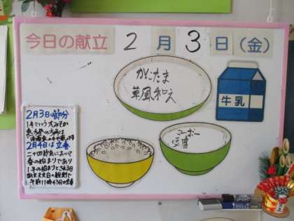 給食メニューと放送室 公開日 2023/02/03 更新日 2023/02/03 日々の活動から 2月3日(金) 給食メニューです。 ごはん、牛乳、かにたま、華風和え、マーボー豆腐 放送当番の様子です。