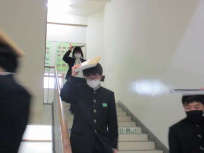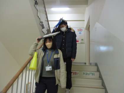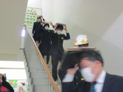 ガレキが天井から落ちてくることを想定して頭部を保護しながら避難しました。