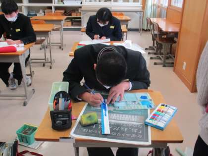 2年生は、美術で色塗りをしている生徒と下書きをしている生徒がいました。