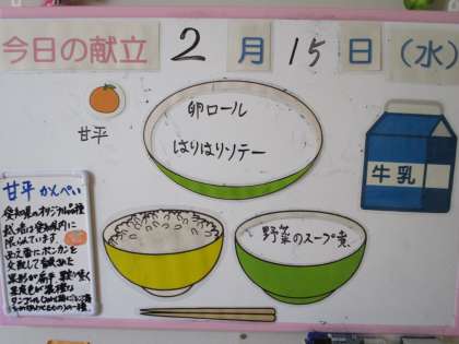 給食メニューと放送室 公開日 2023/02/15 更新日 2023/02/15 日々の活動から 2月15日(水) 給食メニューです。 ごはん、牛乳、卵ロール、はりはりソテー、野菜のスープ煮、甘平 放送当番の様子です。