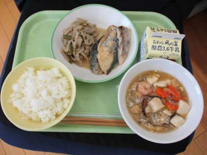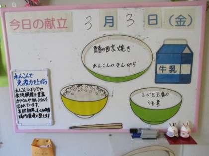 給食メニューと放送室 公開日 2023/03/03 更新日 2023/03/03 日々の活動から 3月3日(金) 給食メニューです。 ごはん、牛乳、鰆の西京焼、れんこんのきんぴら、えびと豆腐のうま煮です。 放送当番の様子です。