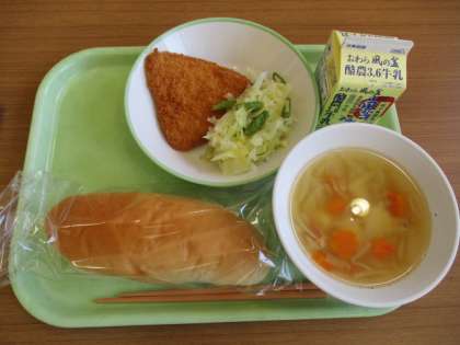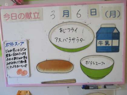 給食メニューと放送室 公開日 2023/03/06 更新日 2023/03/06 日々の活動から 3月6日(月) 給食メニューです。 コッペパン、牛乳、あじフライ、アスパラサラダ、ポテトスープ 放送当番の様子です。