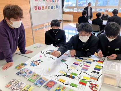 6限の授業の様子 1年生 公開日 2023/03/06 更新日 2023/03/06 日々の活動から 3月6日(月) 1年生は、楡の木タイムで「富山国際大学さんとのSDGsに関する交流」を行いました。 学生が作った富山市版のSDGsすごろくをして、SDGsに親しみました。 今年度のまとめの学習にふさわしい内容になりました。 最後に自分の感想をきっちり言える生徒もいました。 ぜひこれからの学習につなげていきましょう。