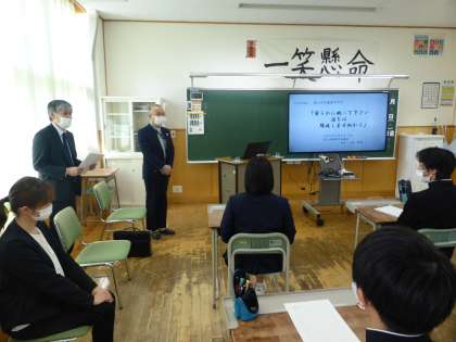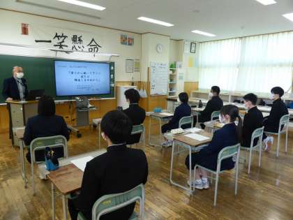 3・4限の2年生楡の木タイムの様子 1 公開日 2023/03/09 更新日 2023/03/09 日々の活動から 3月9日(木) 県被爆者協議会 会長 小島貴雄さんをお招きして、「平和学習」を行いました。
