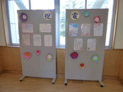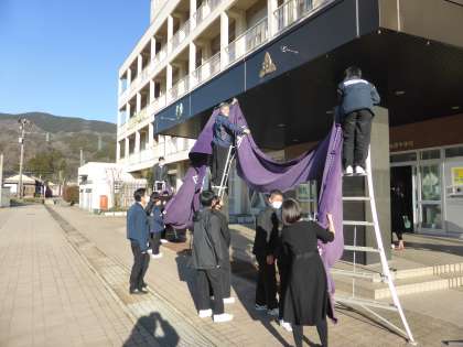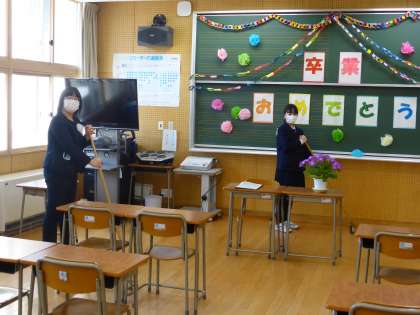 玄関幕を1・2年生の男子で貼りました。 音楽室の掃除や受付を1・2年生の女子で行いました。