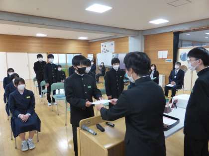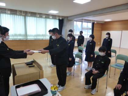 3限 受賞伝達 1 公開日 2023/03/24 更新日 2023/03/24 日々の活動から 3月24日(金) 修了式に先立って各種受賞伝達がありました。 まず厚生実践部から皆勤賞の賞状が渡されました。