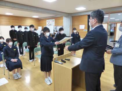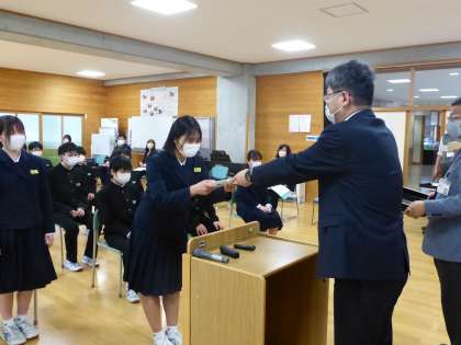 修了式 1 公開日 2023/03/24 更新日 2023/03/24 日々の活動から 3月24日(金) 各学年の代表生徒に修了証が渡されました。 校長は式辞の中で次のようなことを話しました。 「よい卒業式だった。修了式であり、終了式ではない。社会は人と人との信用・信頼で成り立っている。信用・信頼を得ていくにはどうすればよいかを考えていってほしい。4月6日に元気な姿を見せて欲しい。」