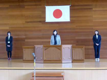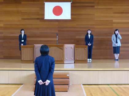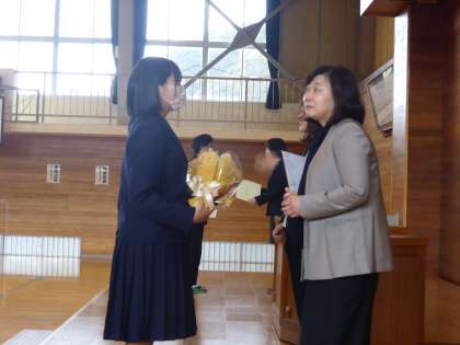 離任式の様子 公開日 2023/04/06 更新日 2023/04/06 日々の活動から 4月6日(木) 始めに、校長が離任者を紹介しました。 次に、離任者から一言ずつ挨拶がありました。中には感極まる先生もいました。 生徒代表の言葉、花束贈呈、歓送で終了しました。