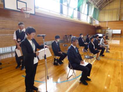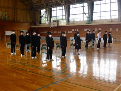 校長は、式辞の中で「中学校は大人になるための学校です。大谷翔平選手が高校時代に立てた目標は8球団からドラフト1位指名されることでした。そのためにどうするかという細かい目標を立てて努力した結果、今があります。みなさんも新しい学年で新しい目標に向かってがんばってください。」と話しました。