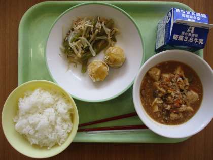 4月14日(金) 給食メニューです。 ごはん 牛乳 にんじんシューマイ 茎わかめのチョナムル マーボー豆腐