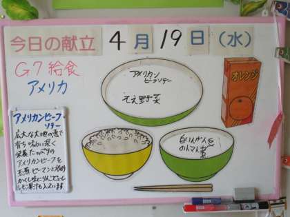 給食メニュー 公開日 2023/04/19 更新日 2023/04/19 日々の活動から 4月19日(水) 今日の給食は、サミット給食第2弾「アメリカ合衆国」です。 ごはん オレンジジュース アメリカンビーフソテー そえ野菜 白いんげん豆のトマト煮