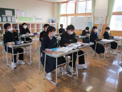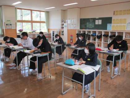 6限の授業の様子 公開日 2023/04/20 更新日 2023/04/20 日々の活動から 4月20日(木) 1年生は、保健体育で50m走の練習をしていました。 2年生は、美術でオリエンテーションでした。 3年生は、英語で「言語についてのクイズを通して言語のおもしろさを知ろう」という内容の授業でした。