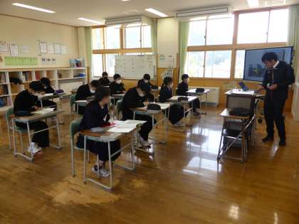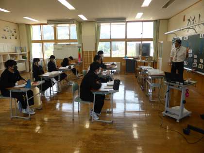 2限の授業の様子 公開日 2023/04/22 更新日 2023/04/22 日々の活動から 4月22日(土) 1年生は、保健体育で1500m走のタイムを計っていました。 2年生は、英語で「朝美とおじの会話を聞き取ろう」という内容の授業でした。 3年生は、理科で「電解質の水溶液の中で起こる変化」という内容の授業でした。