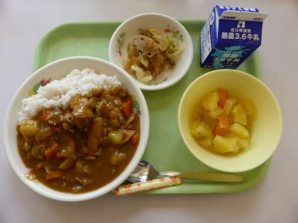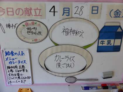 給食メニューと放送室 公開日 2023/04/28 更新日 2023/04/28 日々の活動から 4月28日(金) 給食メニューです。 麦ごはん 牛乳 カレーライス 福神和え フルーツゼリーミックス 棒チーズ 放送当番の様子です。