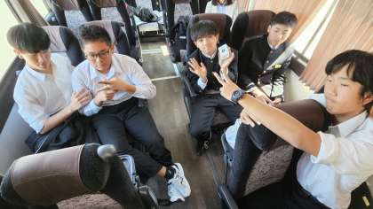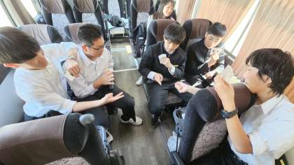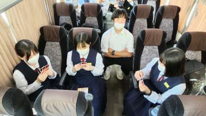 修学旅行1日目その3 公開日 2023/05/09 更新日 2023/05/09 日々の活動から 加斗パーキングエリアにつき、休憩で降りるまで、車内でカードゲームをしていました!その様子です。降りれないほど白熱しています!(停車時に撮影しています。) 楽しい!!