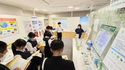 修学旅行2日目その16 公開日 2023/05/10 更新日 2023/05/10 日々の活動から 具体的な製品から環境に配慮した工夫の説明を受けています。 「へぇ〜意外」 「そこまで配慮してるんだ!」
